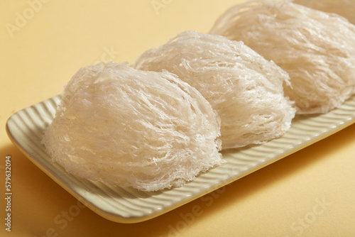 Close up of some raw bird's nests are arranged on a white long rectangular plate, on beige background. Food of natural origin, expensive culinary ingredient for health.