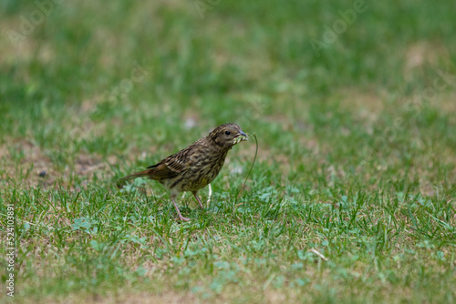 Close up of sooty bunting, Emberiza calandra, also known by its synonym Miliaria calandra feeding on the seeds on a ripe grass blade