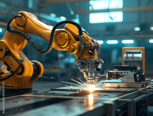 Close up of sparks fly out machine head for metal processing at the factory. Robotic production of automobile assembly parts in the welding department of an automobile manufacturing plant. Automotive