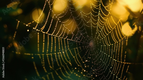 Close Up of Spiderweb with Water Droplets at Golden Hour in Nature