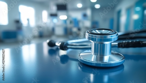 Close up of stethoscope on table in medical clinic setting with blurred hospital background