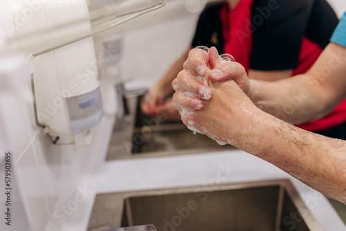 Close up of surgical team members scrubbing arms and hands before surgical operation. Doctor washing hands. Hospital Concept
