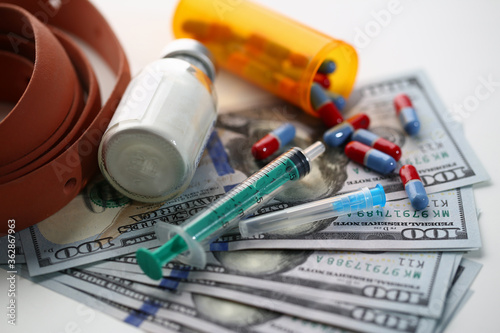 Close up of syringe with injection vaccine, pills and money. Buying or selling illegal substances and drugs