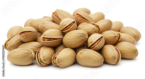 Close Up Of Tan Pistachio Nuts In Shells Stacked High Isolated On White Background