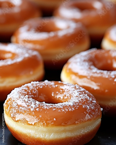Close up of tempting caramel glazed donuts sprinkled with sugar crystals