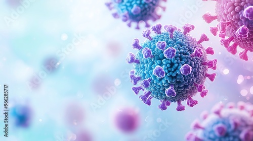 Close up of the blue and purple microscopic spheres of the virus. The background is light blue with blurry light pink particles. This image is the concept banner of the website, featuring a micro viru