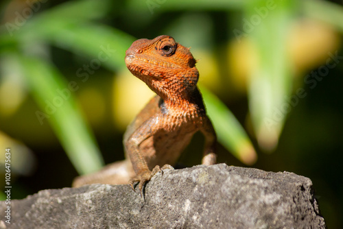 Close up of the oriental garden lizard (Calotes versicolor) or called the oriental garden lizard on the rock