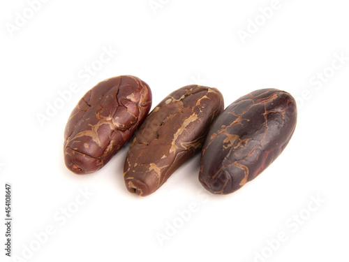 Close up of three refined cacao grains isolated