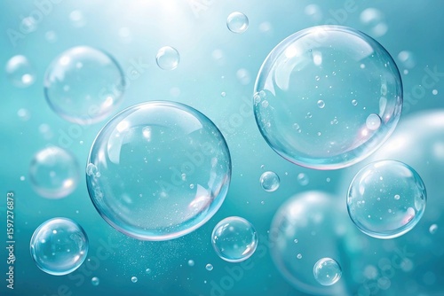 Close up of translucent shimmering soap bubbles floating in clear blue water with soft light.