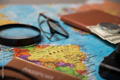 Close up of travel accessories on world map background.