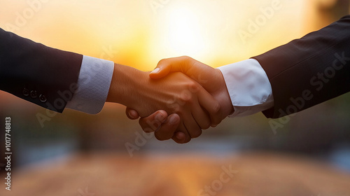 close up of two hands shaking in business setting, symbolizing agreement and partnership during sunset. warm light creates positive and hopeful atmosphere