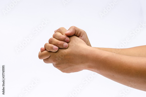 Close up of two hands wash clean with alcohol for protect covid-19, Isolated on white background, place for text or sign. Protect outbreak covid-19 concepts.