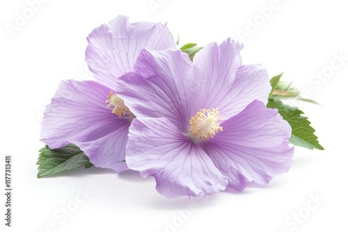 close up of two light purple hibiscus flowers with leaves against a white background