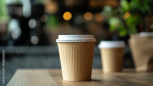 Close up of two paper coffee cups with white lids sitting on a wooden table in a coffee shop setting