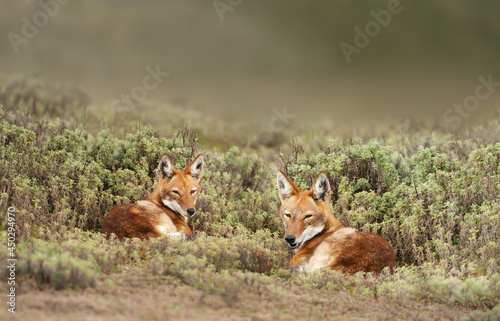 Close up of two rare and endangered Ethiopian wolves lying on grass