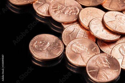 Close up of United States coins, pennies black background