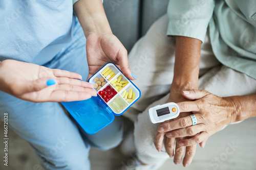 Close up of unrecognizable nurse consulting senior woman in retirement home, copy space
