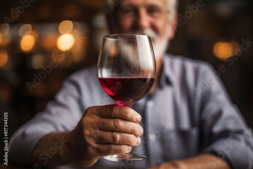 Close up of unrecognizable senior man holding glass of red wine. Close up of unrecognizable mature man holding wineglass