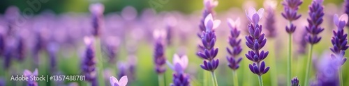 Close up of vibrant lavender flowers in a lush field, showcasing the delicate petals and soft purple hues, delicate, botanical