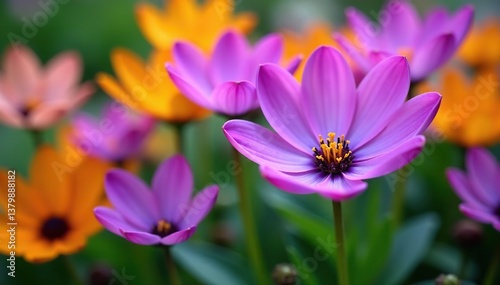 Close up of vibrant violet and yellow flowers in full bloom in a garden, garden, plants