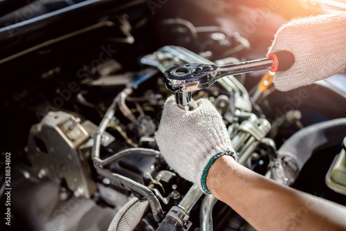 close up of view Auto mechanic repairman using a socket wrench working engine repair in the garage, change spare part, check the mileage of the car, checking and maintenance service concept.