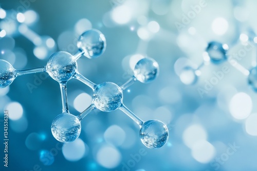 Close up of water molecules on a blue background with bokeh effect and light colors