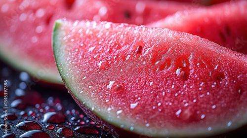 Close Up of Watermelon Slices with Water Droplets on Textured Surface