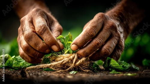Close up of weathered hands carefully tending to a young plant, showcasing detailed textures and earthy tones.
