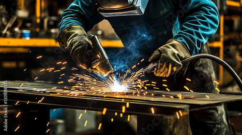 Close Up of Welder in Blue Uniform Sparks Flying During Metalwork on Dark Background
