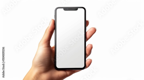 Close up of woman hand holding modern smart phone mockup. New modern black frameless smartphone mockup with blank white screen. Isolated on white background high quality studio shot Modern smart.