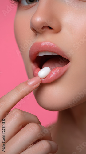 Close up of woman holding white chewing gum near her open mouth on pink background