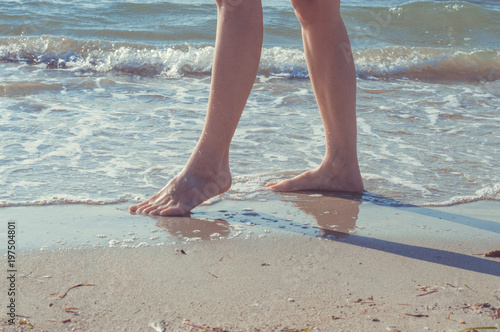 Close up of woman legs walking barefoot on beach in summer holidays. Vacation concept.