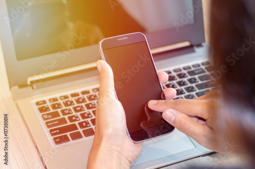 Close Up of woman's hands using mobile phone and laptop computer with blank copy space screen for your advertising text message or content, in the morning light.