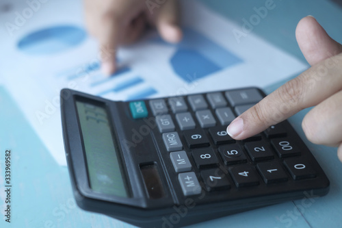 Close up of women using calculator at office desk.