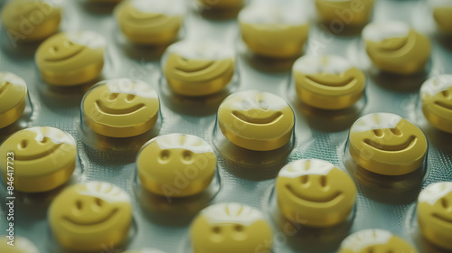 Close up of Yellow Smiley Face Pills on Textured Surface