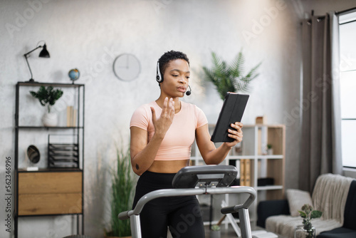 Close up of young active african businesswoman in sportswear and headset training at home working with tablet, doing cardio exercise on treadmill. Concept of sport, business.