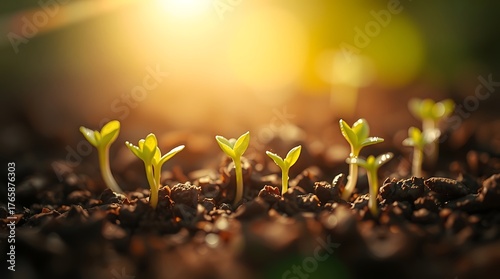Close up of young plants growing in the soil with sun shining through the leaves, symbolizing new life