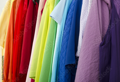 Close up on color coordinated clothes on hangers in a store.