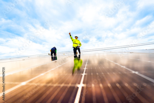 close up on grid of technology renewable solar energy. construction solar panels system on roof. Installing solar photovoltaic panel system. background of blue of solar cell system and structure roof.