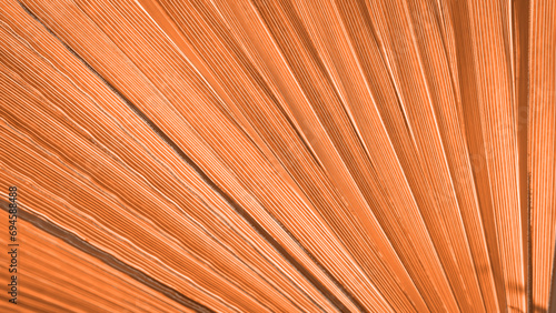 Close up peach fuzz color palm leaf. Peach fuzz Color of the year 2024. Close up palm leaf. Selective focus included