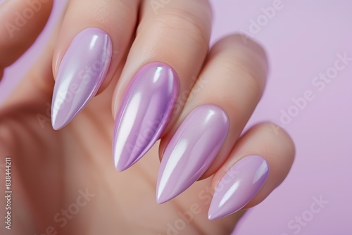 close up perfect almond shaped manicure in metallic pastel lavender color, ivory solid color background
