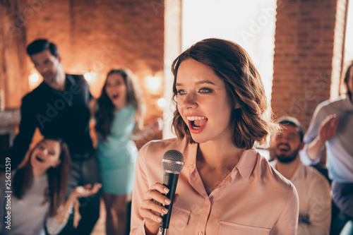 Close up photo best friends buddies six person couples karaoke night weekend vacation hang out vocal soloist she her ladies he him his guys wear dresses shirts formal wear sit sofa loft room indoors