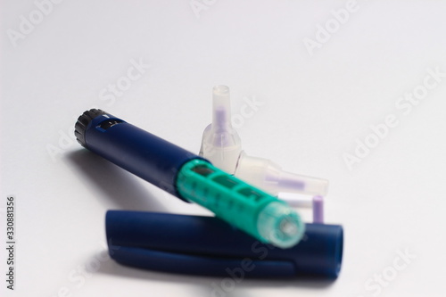 Close Up Photo, Blue and Green Insulin Pen at White Background