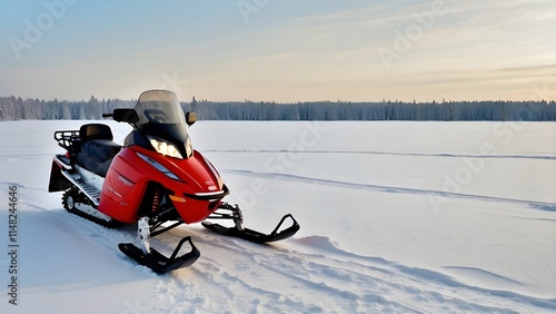 Close up photo of a red snowmobile in the snow, snowy landscape, winter adventure in Lapland, near Saariselka, Finland