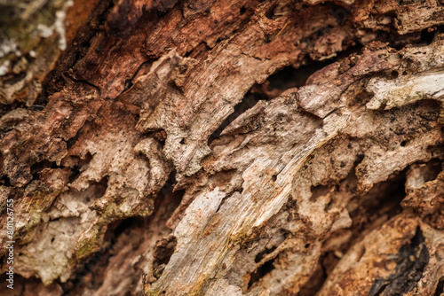 Close up photo of decayed old rotten wood log. Decomposed tree trunk on the ground in the forest. Concept for international forest day, go green, earth day, ecology.