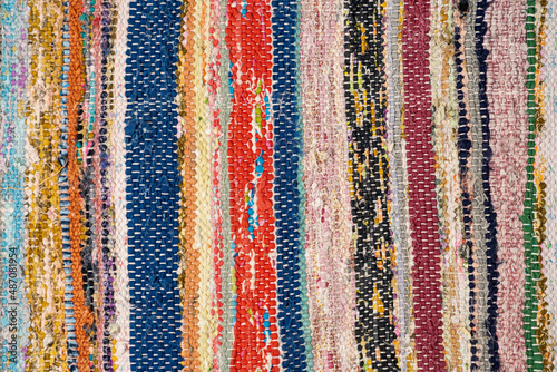 Close up photo of hand crafted, traditional and colorful rug-carpet made with recycled material