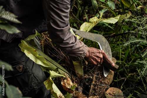 Close up photo of male javanese farmer is sharpening his sickle with a hand sharpening stone while working in the garden.