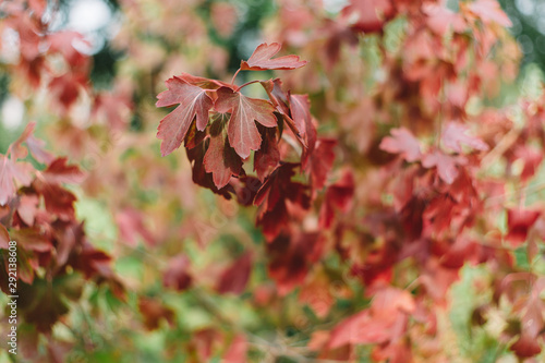 Close up photo of red leaves of maple bushes. Gold autumn concept. Change of season, rebirth of nature. Selective focus, blurred background.