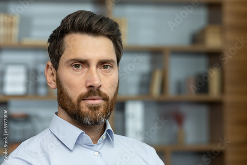 Close up photo of serious boss in shirt in home office, mature man with beard looking at camera thinking, businessman investor headshot.