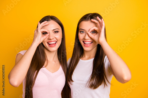 Close up photo two people beautiful funky funny she her ladies models show okey symbol near eyes advising buy buyer novelty tested quality wear white pink casual t-shirts isolated yellow background